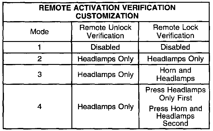 2. Turn the ignition to the ACC position. The seat belt telltale flashes and the chime bongs 1-4 times, equal to the current customization mode. This indicates which mode the vehicle is in. Each time the transmitter LOCK button is pressed, the mode number advances. A transition past mode 4 will repeat, starting again at mode 1.