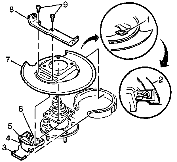 1. Install the parking brake support plate (7).