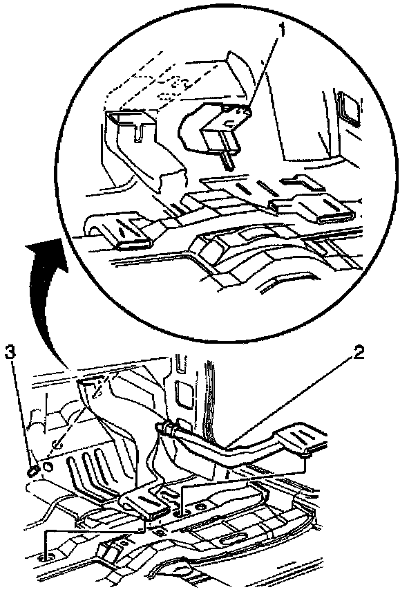 3. Unsnap the rear floor air outlet duct (2) from the studs and the holes in the floor reinforcement.