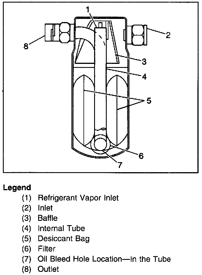 The sealed accumulator is connected to the evaporator outlet pipe. The accumulator stores the refrigerant (vapor and liquid) and the oil from the evaporator. A desiccant at the accumulator bottom dries any moisture in the system. An oil bleed hole at the accumulator outlet pipe end provides the oil return path to the compressor. The accumulator is not serviceable and should only be replaced when leaking due to the following conditions: