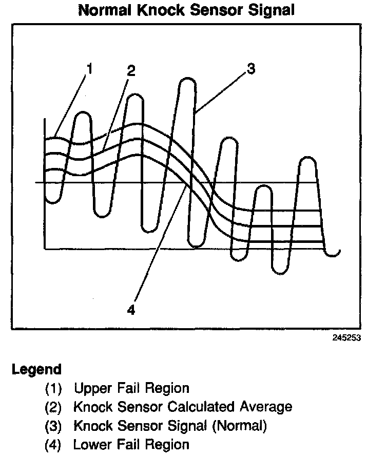 The PCM contains integrated knock sensor (KS) diagnostic circuitry. During operation, the PCM calculates an average voltage of each knock sensor's signal and performs instantaneous signal voltage readings. The PCM uses the instantaneous signal voltage readings to determine the state of the knock sensor circuitry. If the knock sensor system is operating normally, the PCM monitors instantaneous signal voltage readings varying outside a voltage range above and below the calculated average voltage (refer to the normal knock sensor figure).