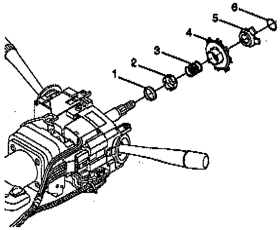 3. Remove the bearing retainer (6) using tools J 23653-SIR and J 42137. Dispose of the bearing retainer. Remove the cam orientation plate (5). Remove the turn signal cancel cam assembly (4). Remove the upper bearing spring (3). Remove the upper bearing inner race seat (2). Remove the inner race (1).