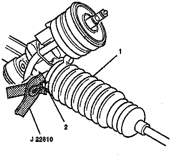 2. Prior to boot installation, apply grease to the inner tie rod assembly (2) and the rack and pinion gear assembly (1).