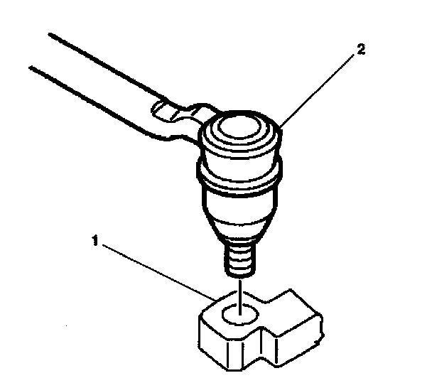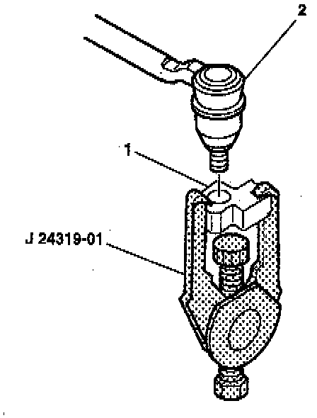 3. Remove the outer tie rod assembly (2) from the steering knuckle (1) using J 24319-01.