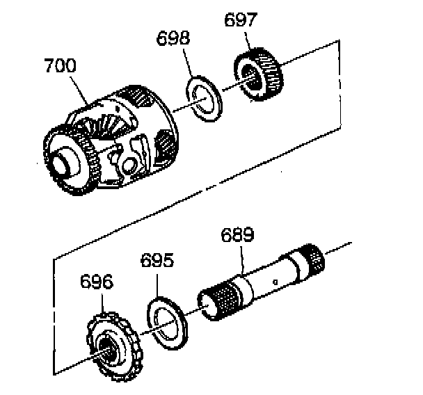 (697), parking gear (696), thrust bearing (695) and sun gear shaft (689) into the differential (700).