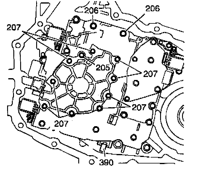 1. Remove the eleven indicated oil pump bolts (206, 207).
