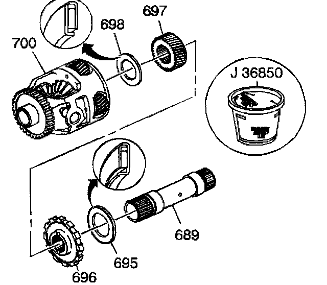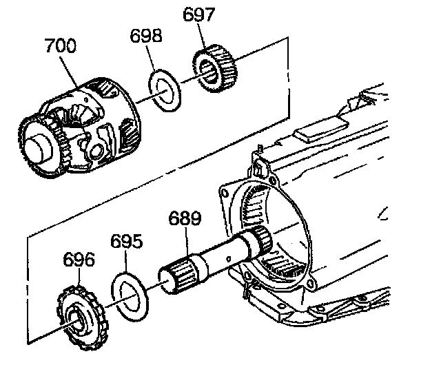 1. Assemble the sun gear thrust bearing (698), the differential carrier sun gear (697), the park gear (696), the internal gear thrust bearing (695) and the sun gear shaft (689) into the differential carrier (700).