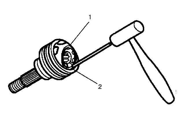 12. Tilt the CV joint cage (1) in the opposite direction to remove the opposing chrome alloy ball (2).