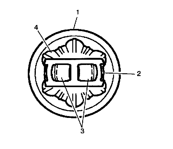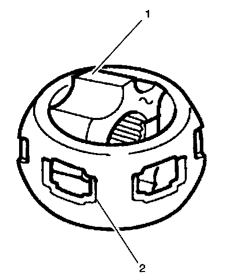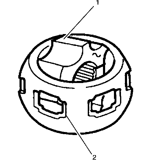 7. Hold the inner race 90 degrees to centerline of cage with the lands of the inner race (1) aligned with the windows of the cage (2) and insert the inner race into the cage.
