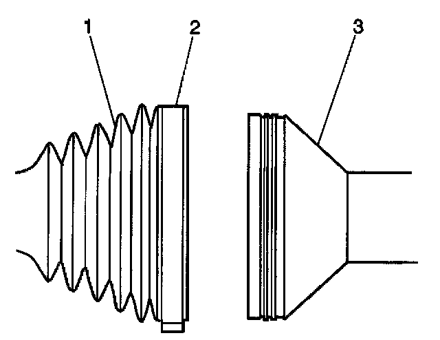 14. Slide large diameter of the halfshaft outboard boot (1) with the large boot retaining clamp (2) in place over the outside of the CV joint outer race (3) and locate the boot lip in the groove on the CV joint outer race.