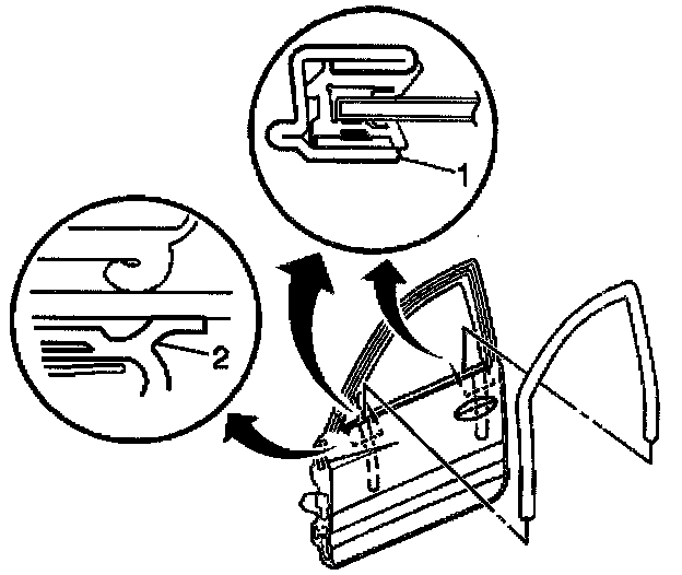 1.1. The window run channel outboard lip at the rearview mirror is rolled over or the glass run channel outboard lip at the B pillar is rolled over (2).
