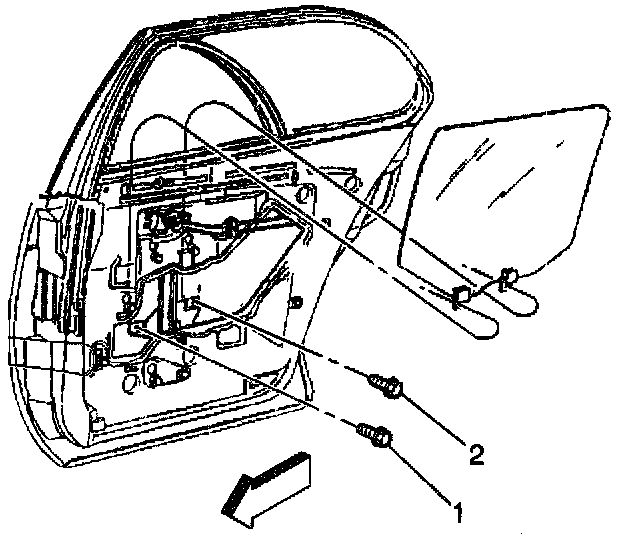 2. Install the rear door window to the rear door window regulator bolts (1) (2).