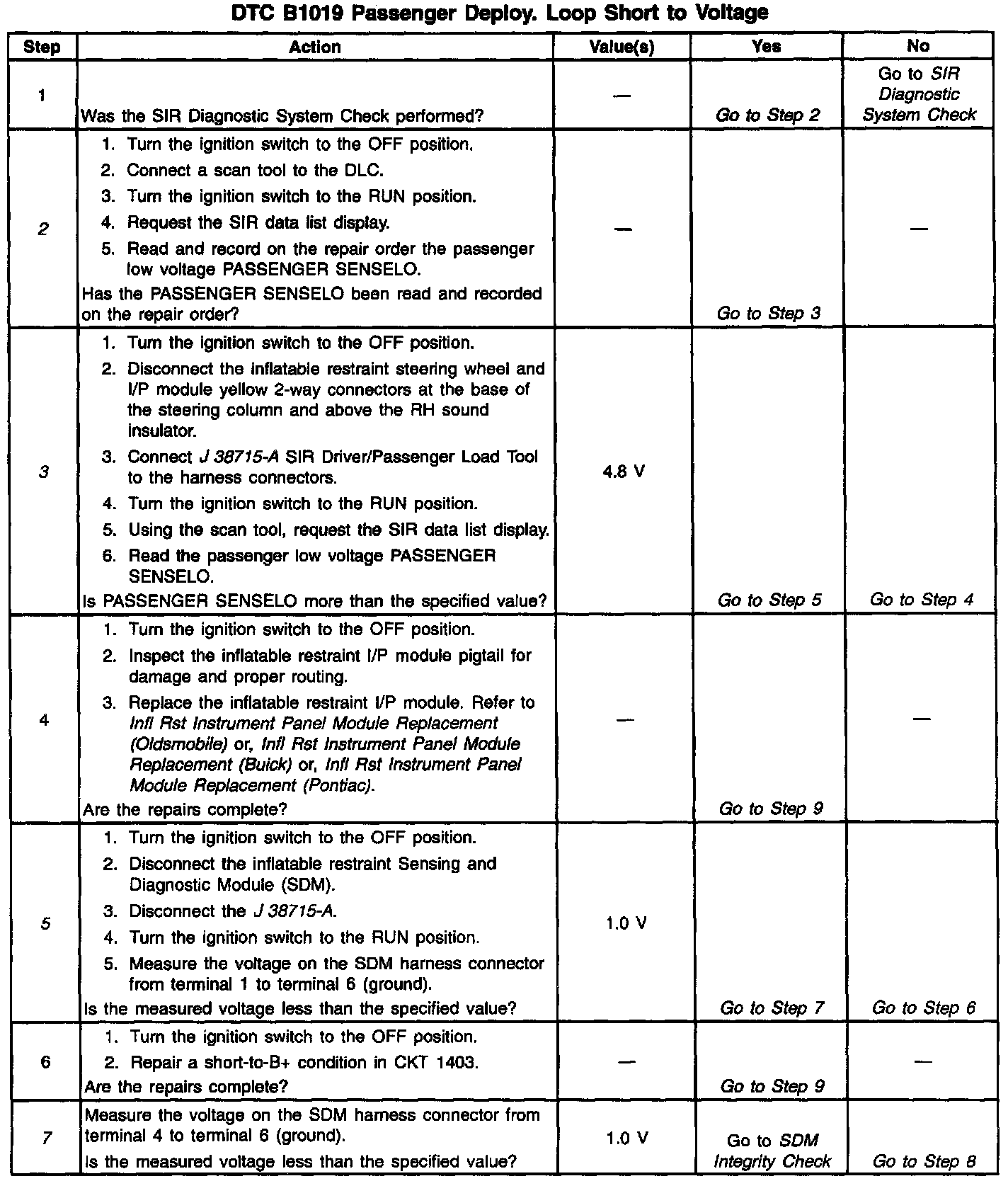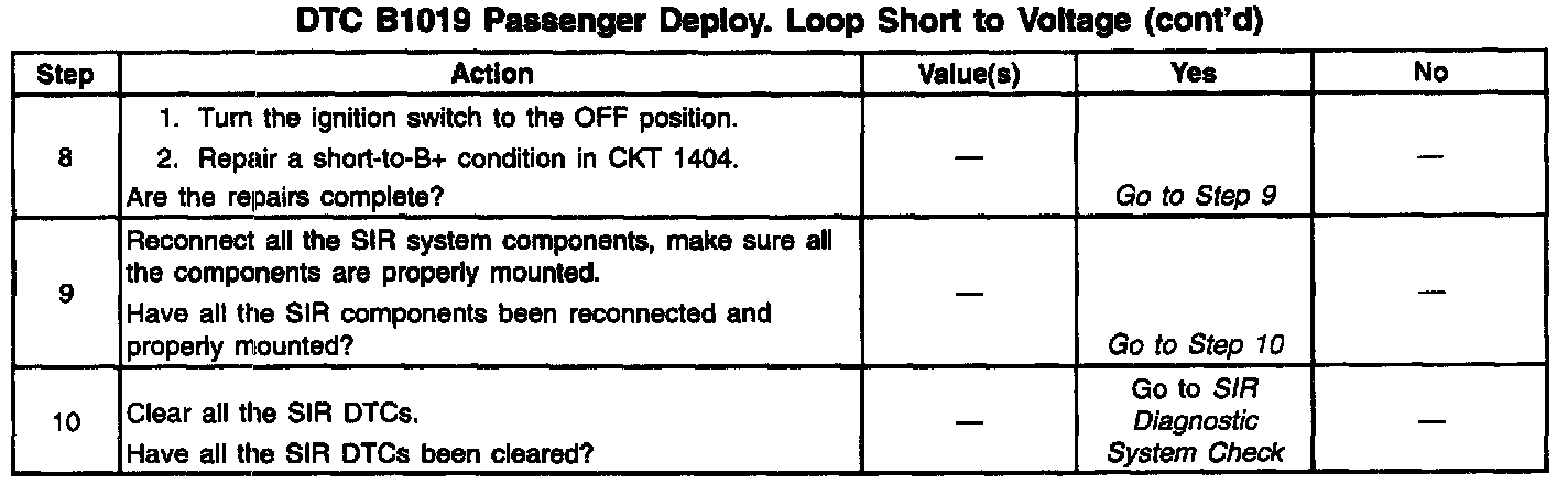 A short to B+ in the inflatable restraint IP module circuit can cause an intermittent condition. Inspect CKT 1403 and CKT 1404 carefully for cutting or chafing. Wiring pigtail damage requires replacement of the inflatable restraint IP module. The diagnostic table directs the technician to note the entry value of PASSENGER SENSELO. Comparing the value of PASSENGER SENSELO can be helpful in determining if an intermittent condition exists. When measurements are requested in this table, use J 39200 Digital Multimeter with the correct terminal adapter from J 35618-A Connector Test Adapter Kit. When a check for proper connection is requested, refer to Intermittents and Poor Connections. When a wire, connector or terminal repair is requested, use J 38125-A Terminal Repair Kit and refer to Wiring Repair. Intermittent Problems Service and Repair