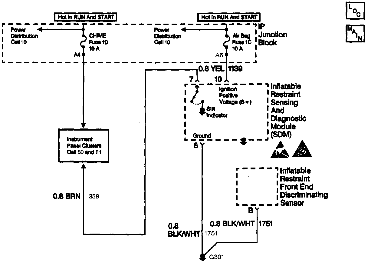 In the RUN position, the ignition switch applies battery voltage to the AIR BAG warning lamp and to the IGNITION POSITIVE VOLTAGE input terminal 10. The inflatable restraint Sensing and Diagnostic Module (SDM) responds by flashing the AIR BAG warning lamp seven times. The SDM monitors the lamp driver output by comparing the output state at the SIR INDICATOR terminal 7 to the microprocessor commanded state.