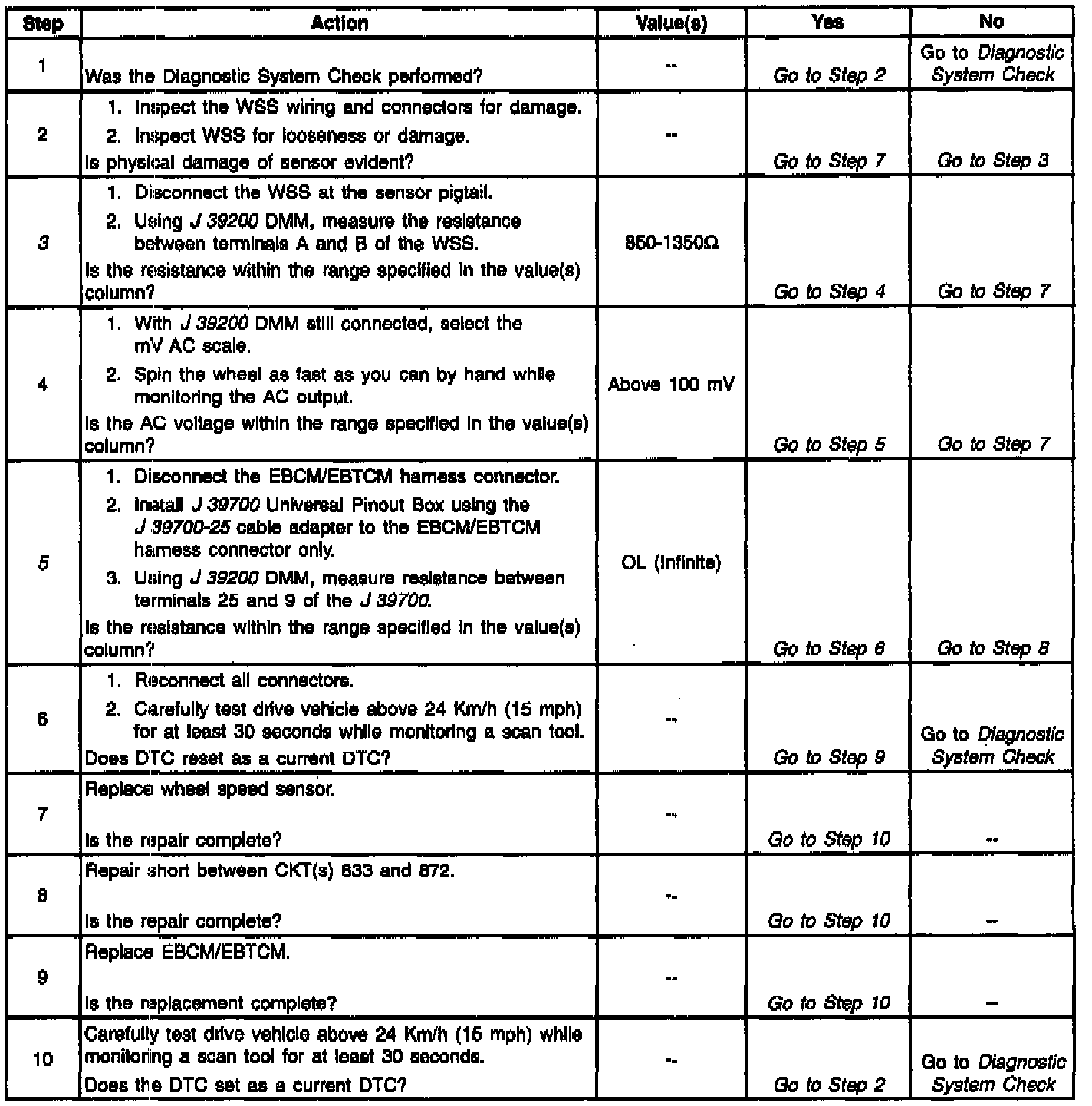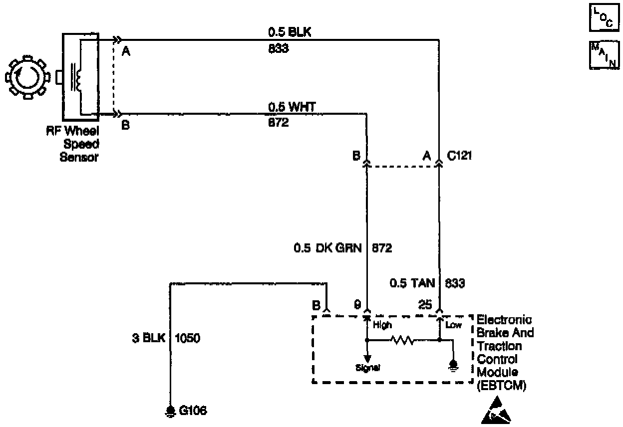 The Wheel Speed Sensor (WSS) is a single point magnetic pickup that produces an AC signal. The Electronic Brake Control Module/Electronic Brake Traction Control Module (EBCM/EBTCM) uses the signal frequency in order to calculate the wheel speed.