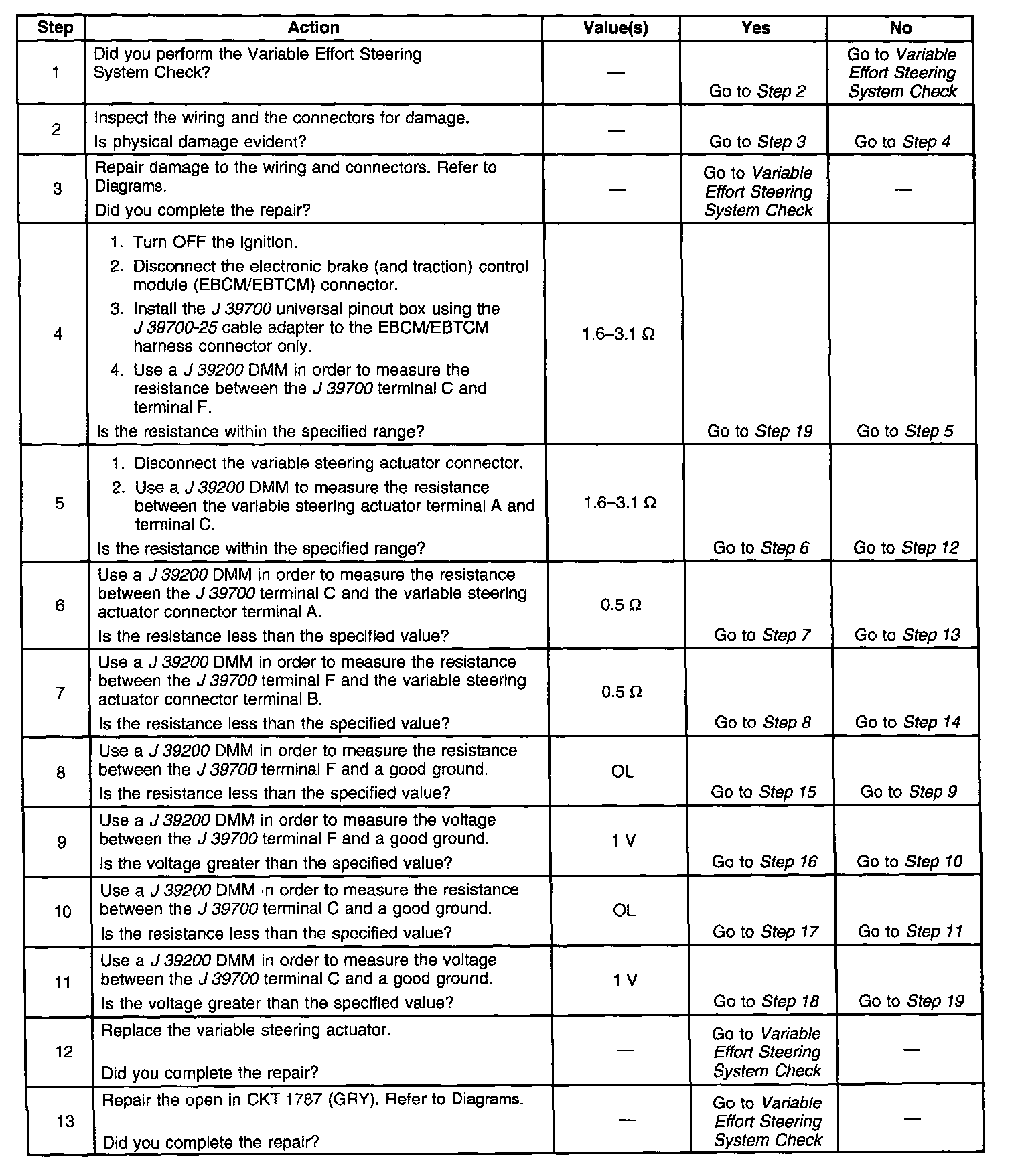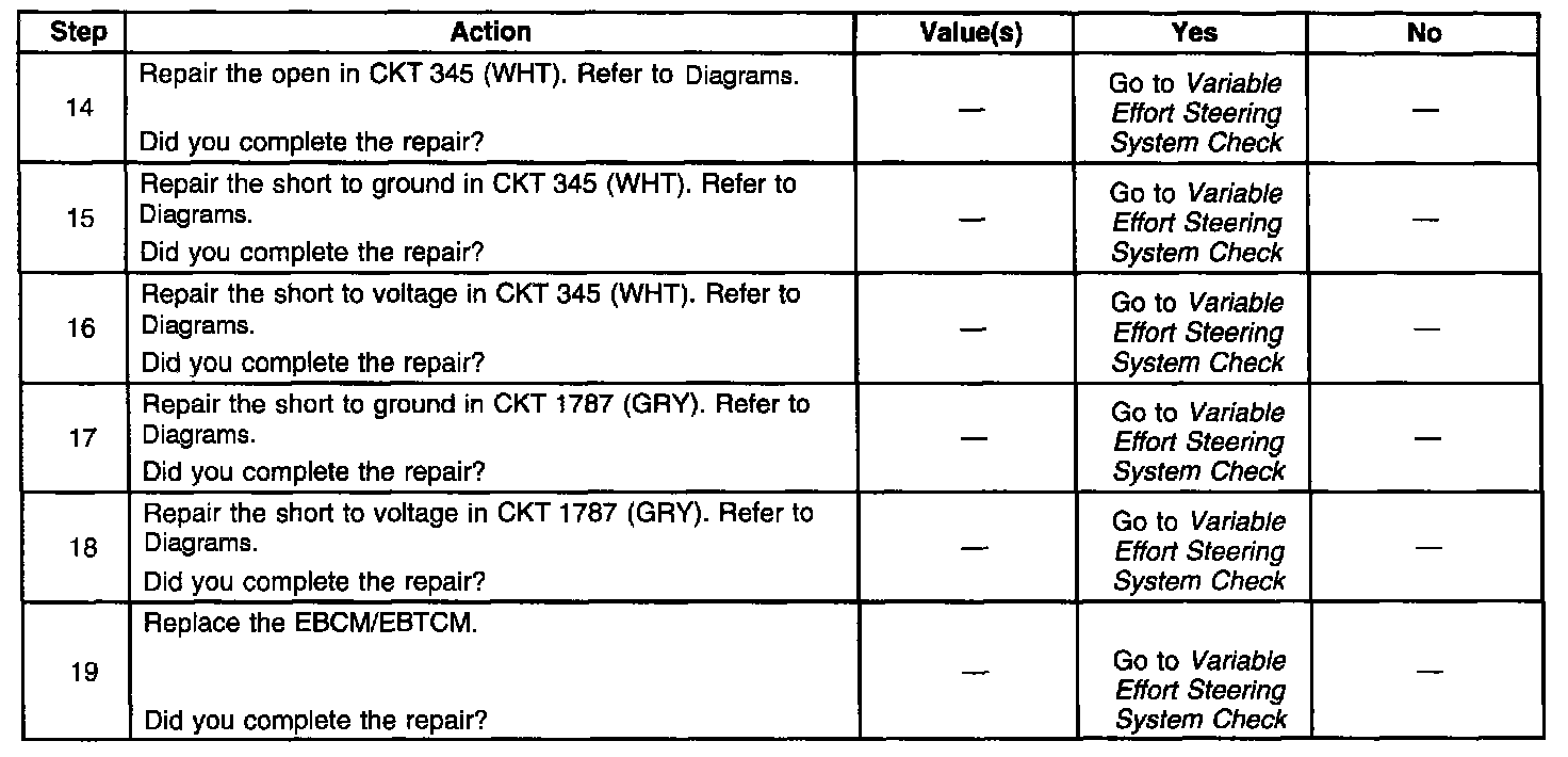 The EBCM/EBTCM detects an open or a short in the steering circuit by comparing feedback current to the commanded current. If the feedback current is less than 360 mA while the absolute value of the commanded current is greater than 826 mA for 0.5 seconds, a fault is present.