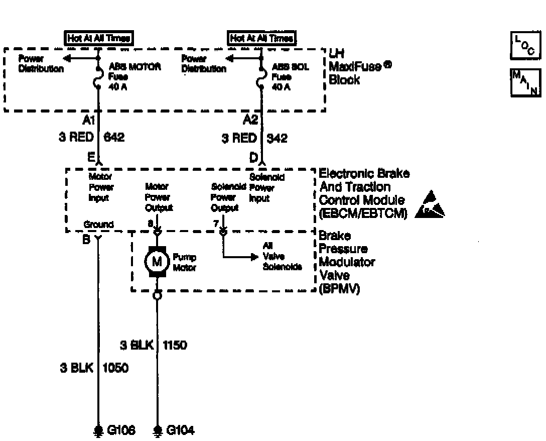 The Brake Pressure Modulator Valve (BPMV) pump motor ground is supplied through a ground stud on the pump motor to a good ground.