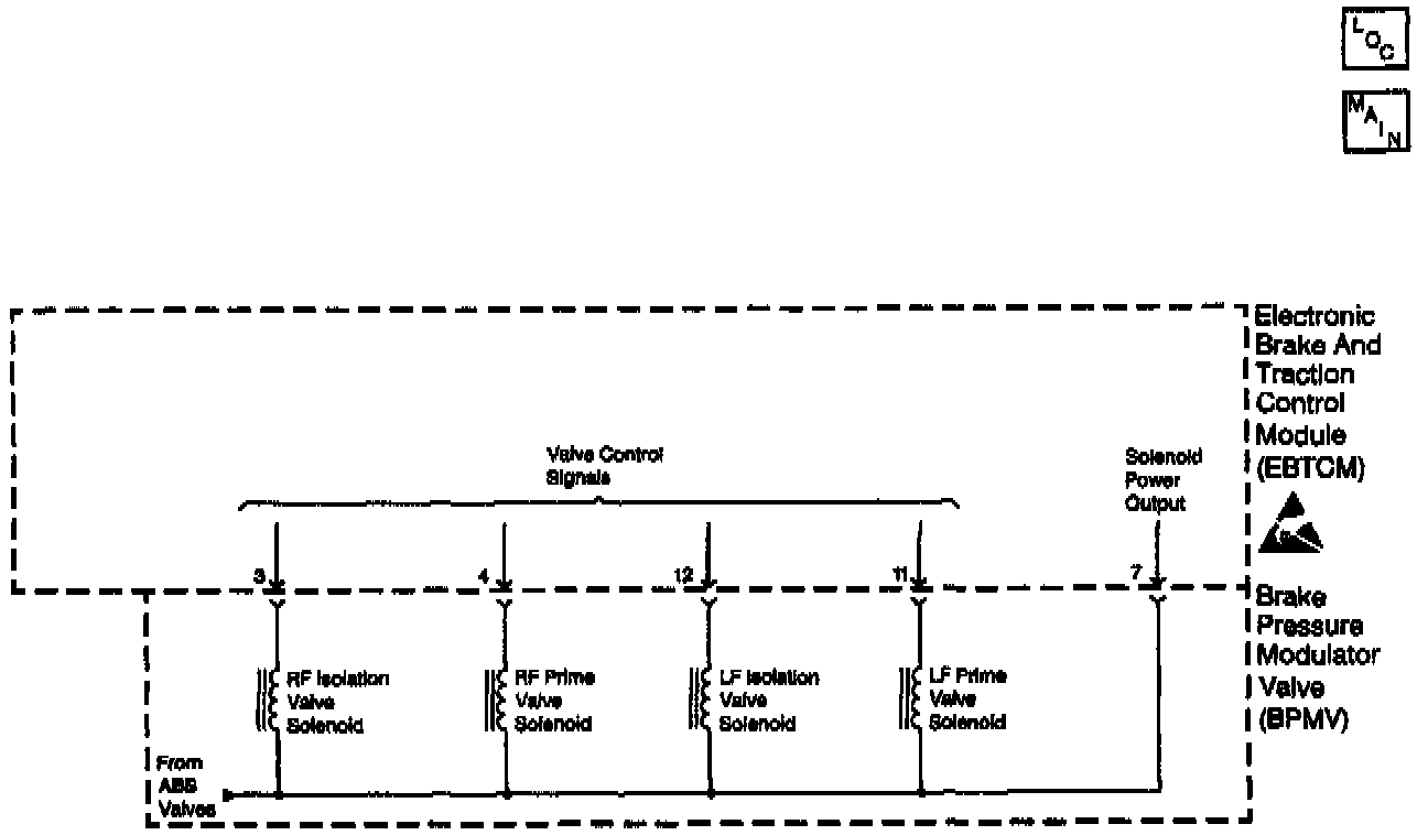 The Master Cylinder Isolation valve solenoid circuits are supplied with battery power when the ignition is in the RUN position. The Electronic Brake and Traction Control Module (EBTCM) controls the valve functions by grounding the circuit when necessary.