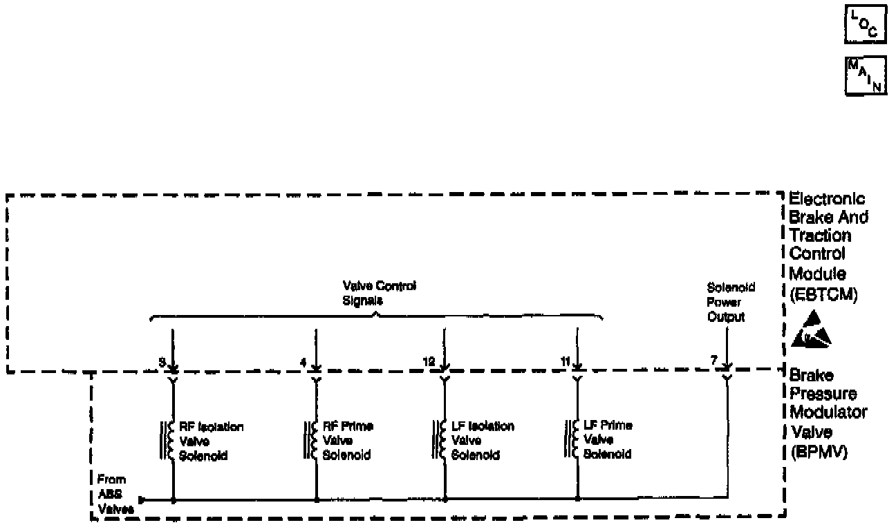The Traction Control System (TCS) Prime valve solenoid circuits are supplied with battery power when the ignition is in the RUN position. The Electronic Brake and Traction Control Module (EBTCM) controls the valve functions by grounding the circuit when necessary.