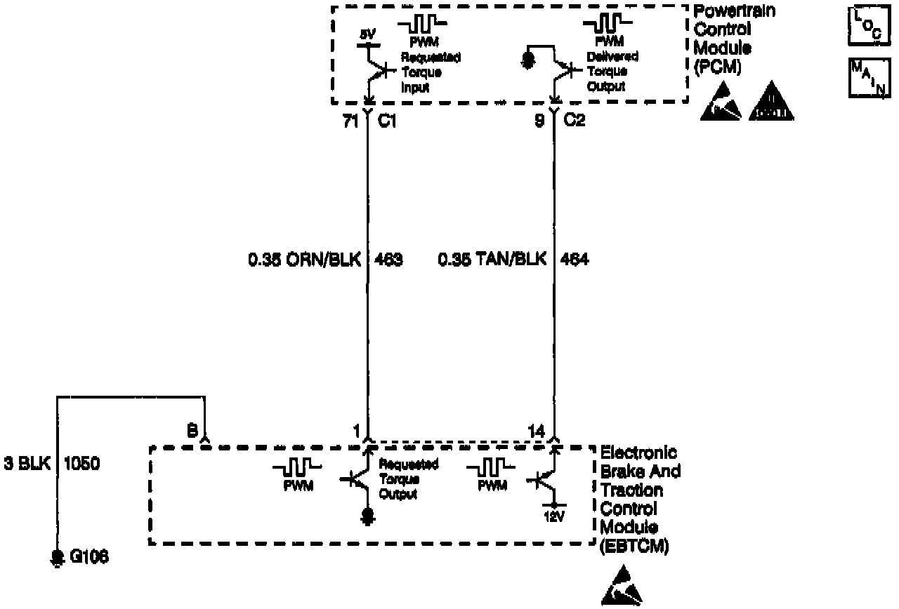 The Electronic Brake and Traction Control Module (EBTCM) and the Powertrain Control Module (PCM) simultaneously control the traction control. The PCM sends a DELIVERED TORQUE message via a Pulse Width Modulated (PWM) signal to the EBTCM confirming the delivered torque level for proper Traction Control System (TCS) operation. The EBTCM supplies the pull up voltage.