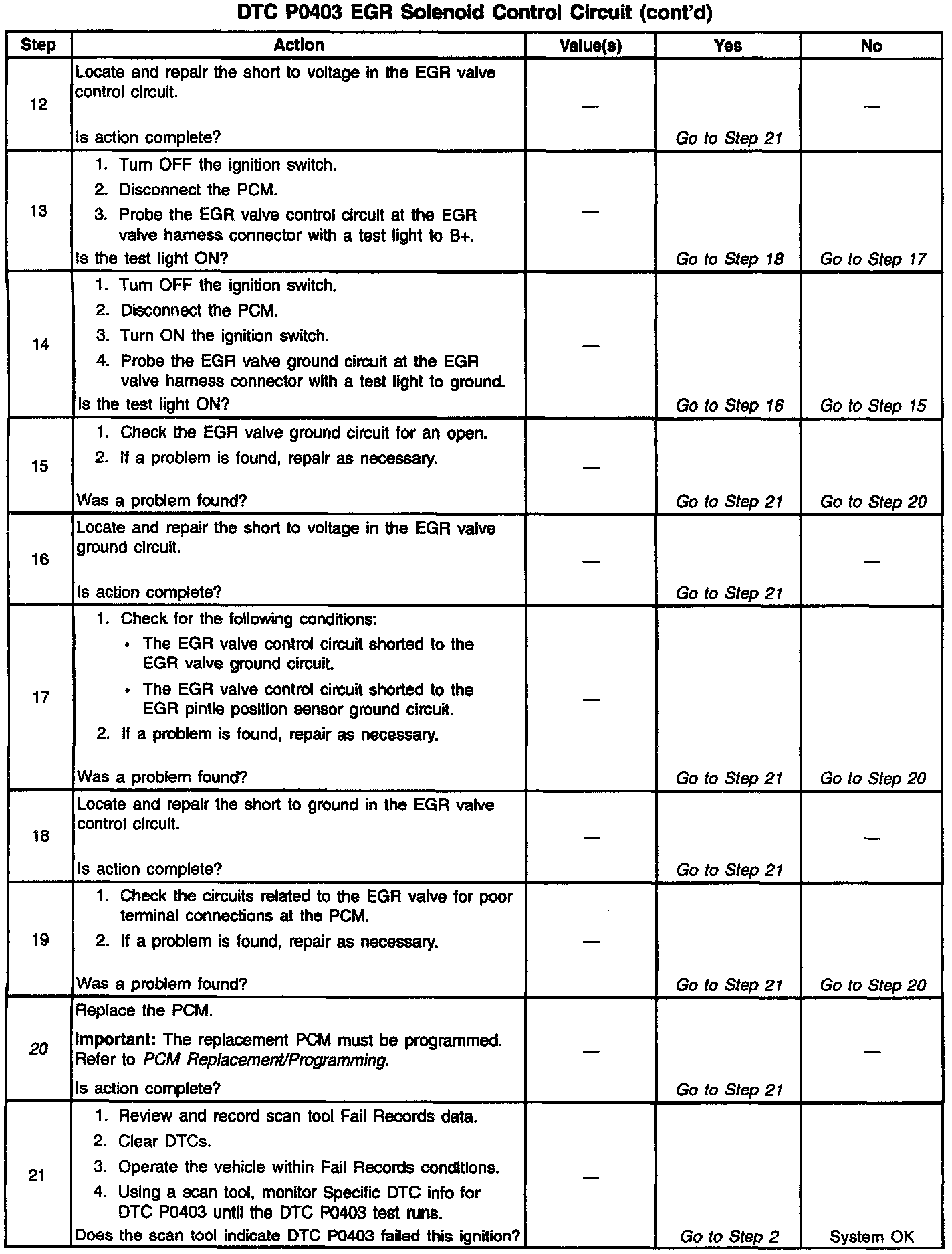 The PCM monitors the EGR valve pintle position input to ensure that the valve responds properly to commands from the PCM. The Linear EGR valve is controlled by using an ignition positive driver and ground circuit within the PCM. The driver has the ability to detect an electrical malfunction in the ignition positive or ground circuit. If an electrical malfunction occurs, the driver signals the PCM to set DTC P0403.