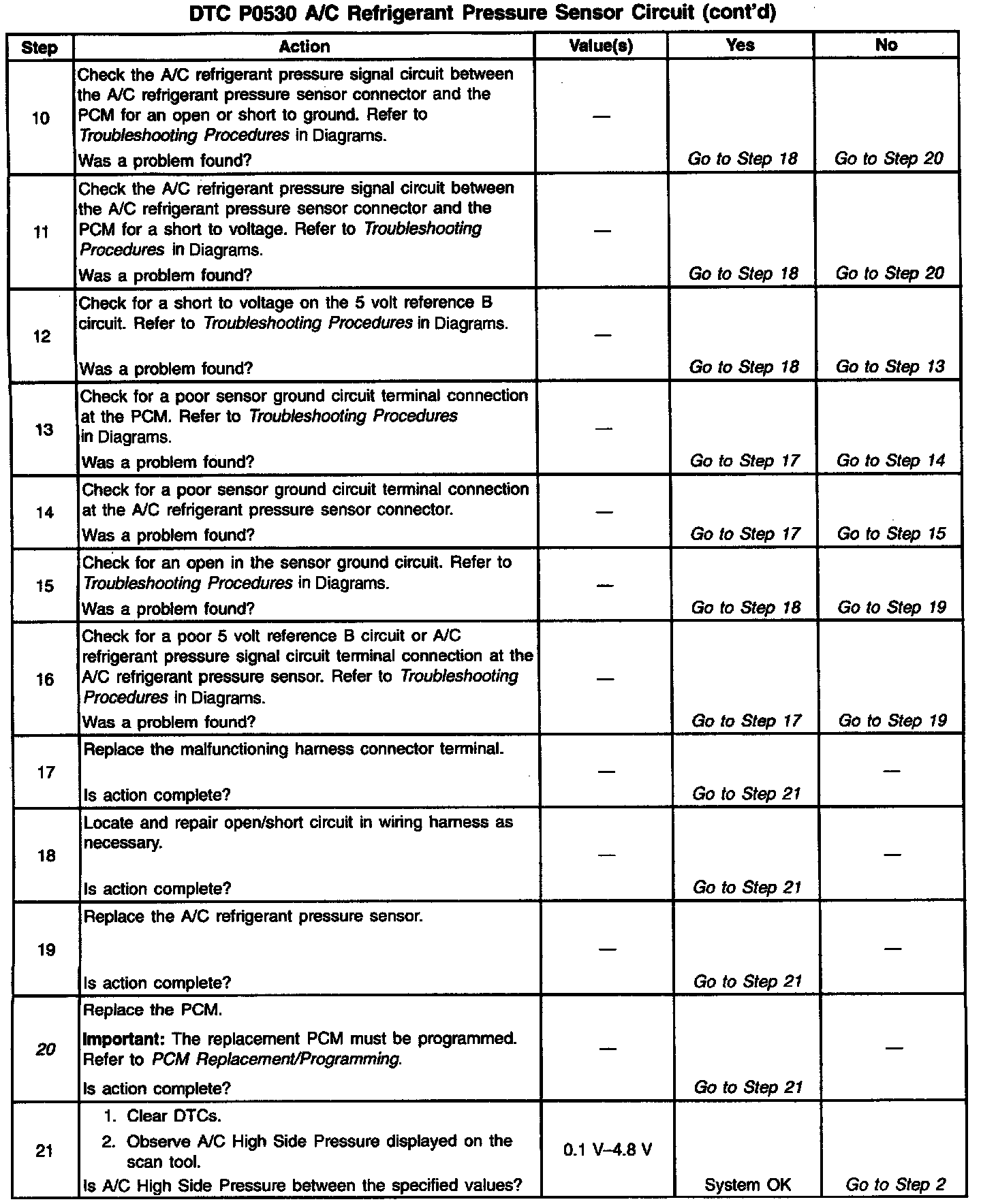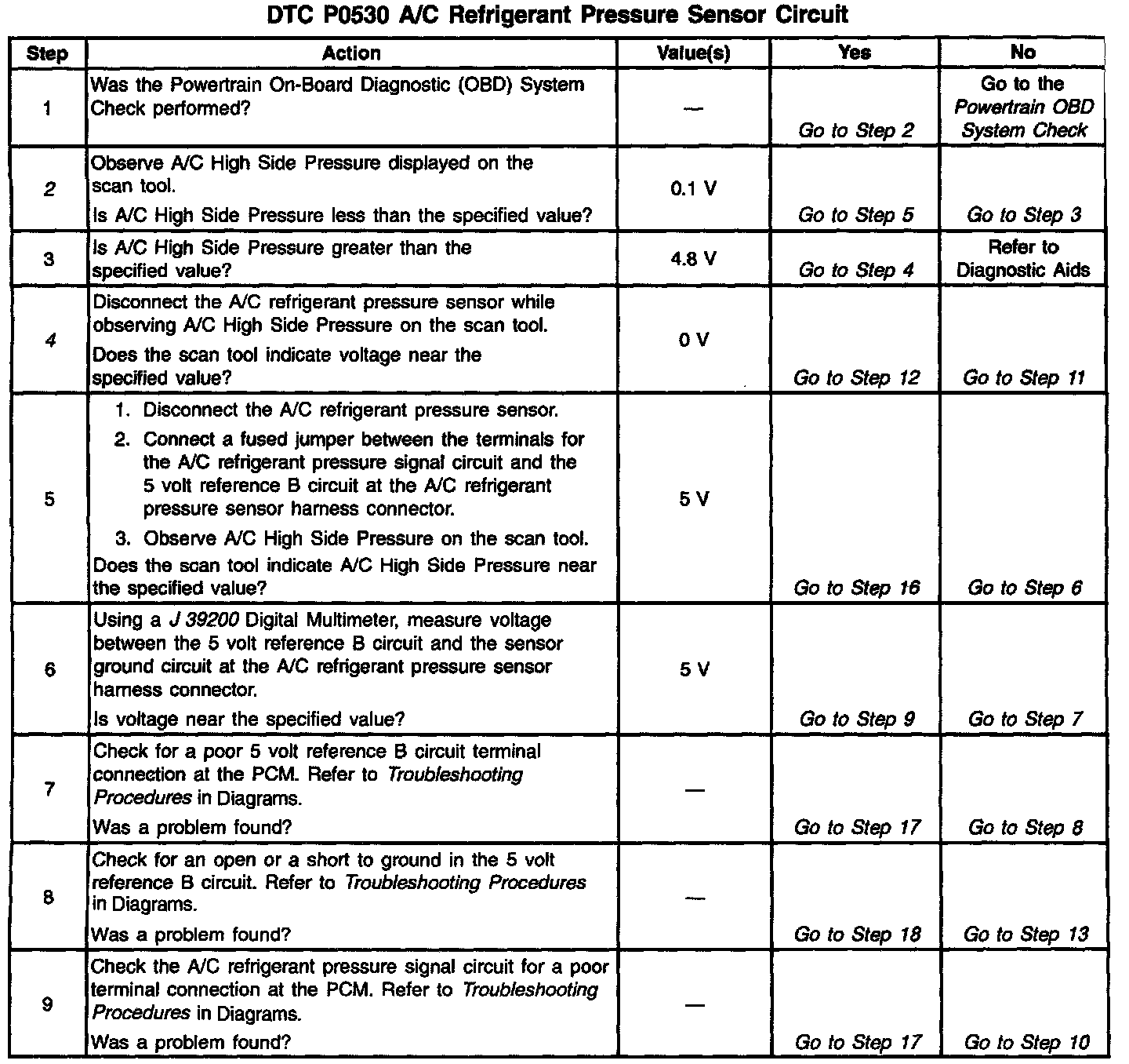 2. Normal A/C refrigerant pressure sensor signal voltage is between 0.1 and 4.8 volts. If A/C voltage is within range, review Fail Records data to determine the conditions that were present when DTC P0530 set.