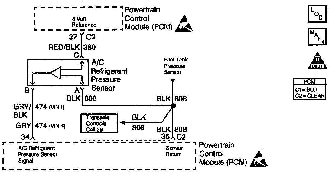 4. If the A/C refrigerant pressure signal voltage stays high after disconnecting the A/C refrigerant pressure sensor electrical connector, the signal circuit is shorted to voltage or the PCM is malfunctioning.