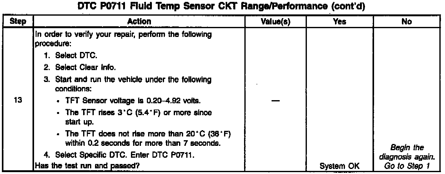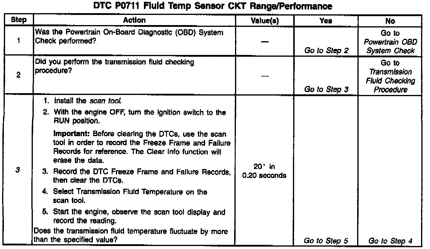 If the PCM detects an intermittent voltage or no voltage change in the TFT sensor circuit, in two consecutive trips, then DTC P0711 sets. DTC P0711 is a Type D DTC.