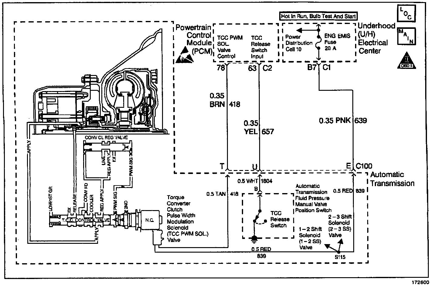 The Powertrain Control Module (PCM) controls the Torque Converter Clutch Pulse Width Modulation Solenoid Valve (TCC PWM Sol. Valve). The solenoid controls the hydraulic fluid for Torque Converter Clutch (TCC) apply and release. When the TCC is fully applied, the engine is coupled directly to the transmission through the TCC. The Torque Converter Clutch (TCC) used is the Electronically Controlled Converter Clutch (EC3). The EC3 allows the TCC to slip without excessive wear. This allows smooth application and release of the TCC. The PCM will normally allow a small amount of slip to occur with the EC3. This prevents fluid pressure in the torque converter from becoming too great. Very high pressure in the torque converter will damage the converter. When the TCC Pulse Width Modulated (PMW) Sol. Valve engages the TCC, TCC slip speed is approximately 20 RPM.