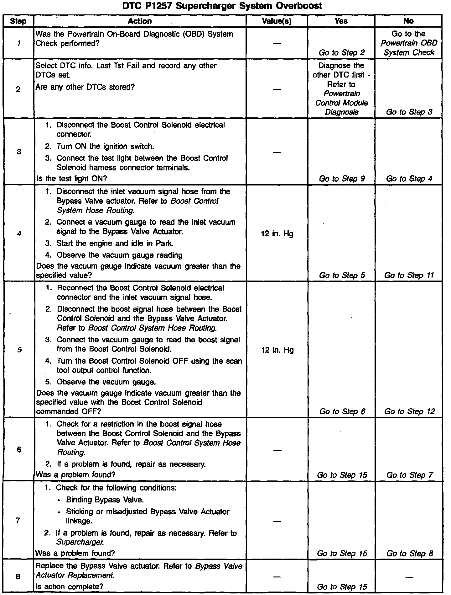 1. Checks the Boost Control Solenoid control circuit. A short to ground in the Boost Control Solenoid control circuit will keep the bypass valve closed when the PCM is commanding it open, possibly causing an overboost condition during high engine load situations.