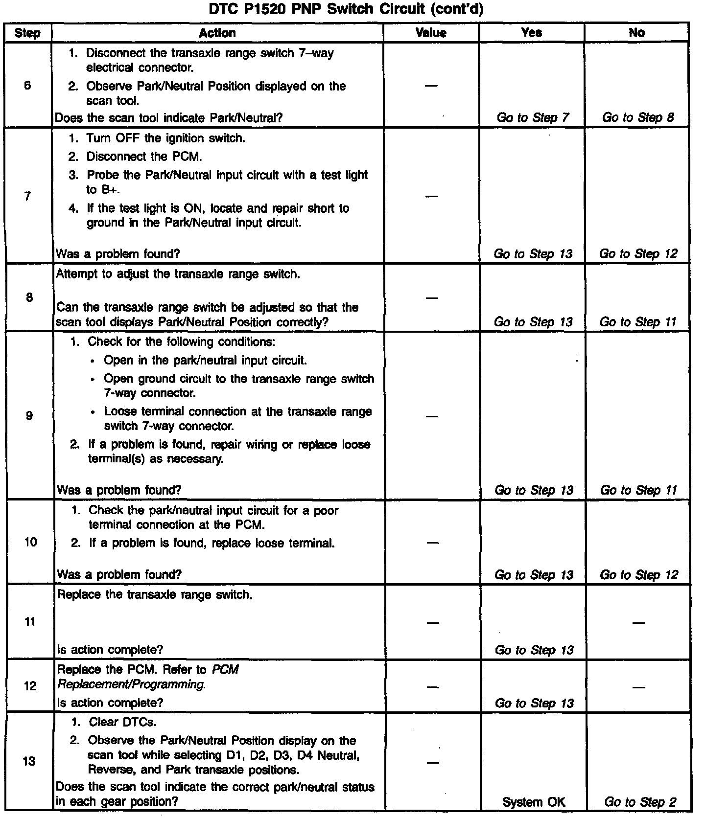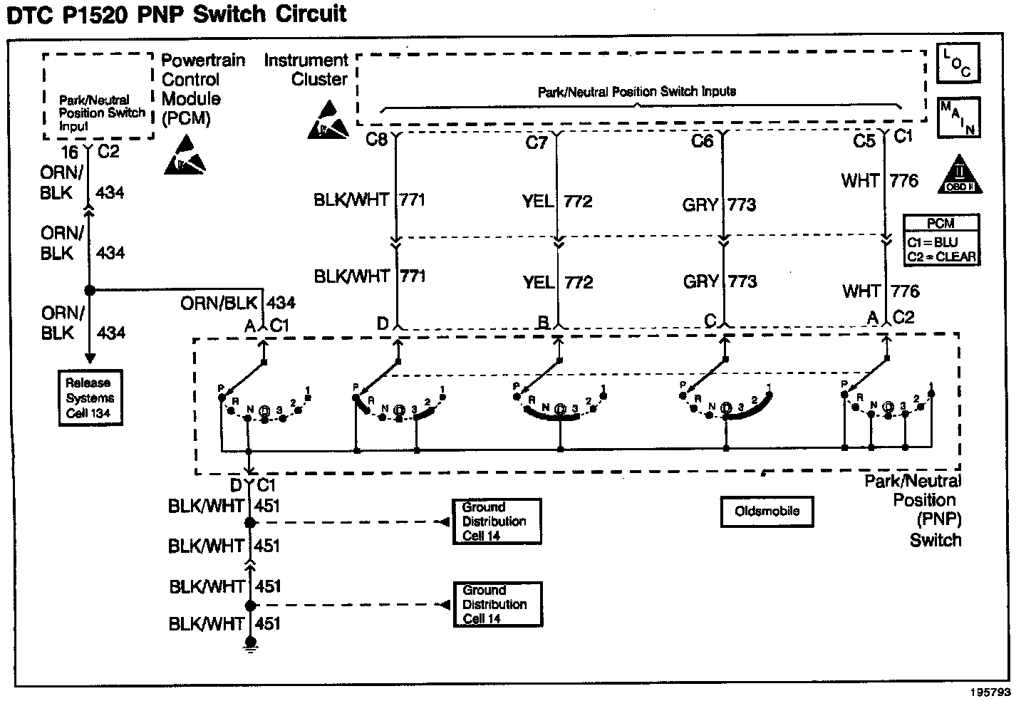 The PCM supplies 12 volts to the PNP input circuit through a current limiting resistor. The PCM senses a closed switch (Park or Neutral selected) when the voltage on the PNP input circuit drops below 1 volt.