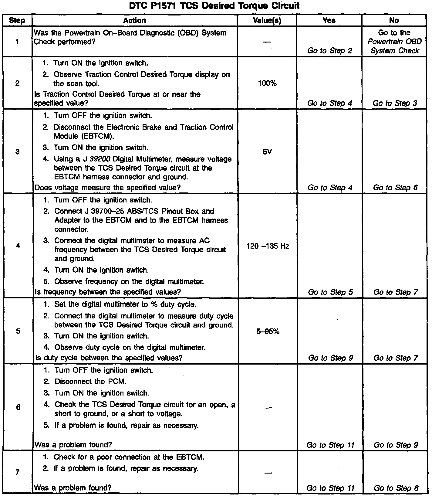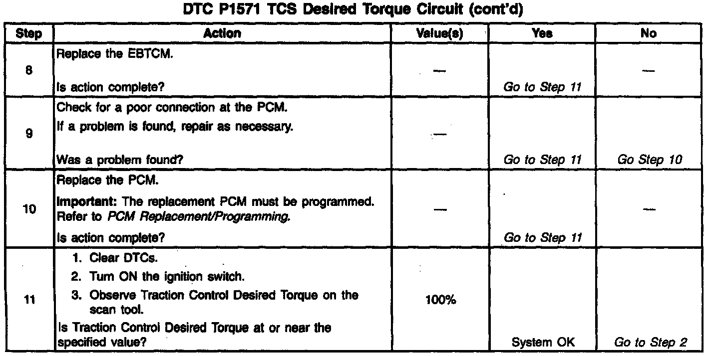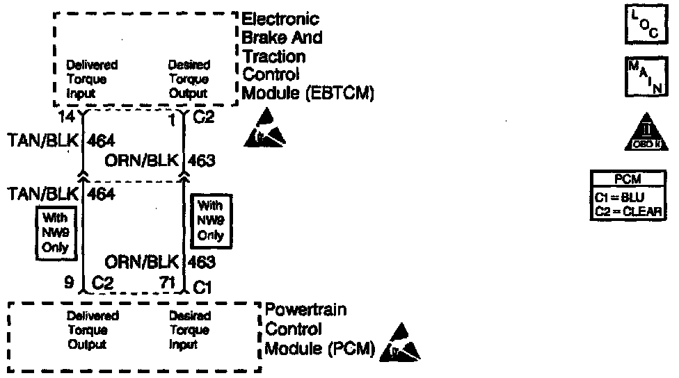 To determine the amount of torque reduction required, the PCM monitors the TCS Desired Torque Pulse Width Modulated (PMW) signal from the Electronic Brake and Traction Control Module (EBTCM). The PCM also provides a TCS Delivered Torque signal informing the Electronic Brake and Traction Control Module (EBTCM) how much torque is being produced by the engine. The Traction Control Desired Torque display on the scan tool indicates the amount of engine torque requested by the Electronic Brake and Traction Control Module (EBTCM). With traction control not active, Traction Control Desired Torque should vary between 99% and 100%. The Traction Control Desired Torque percentage displayed on the scan tool is not the PWM duty cycle.