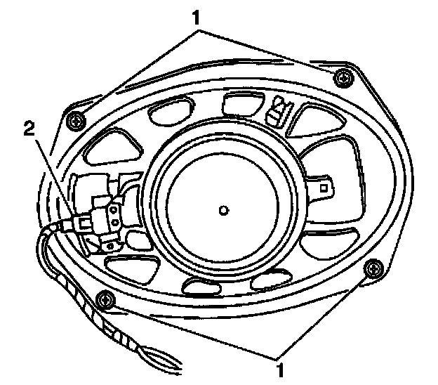 2. Remove the fasteners (1) retaining the rear speaker to the rear speaker retainer. Partially lower the speaker.