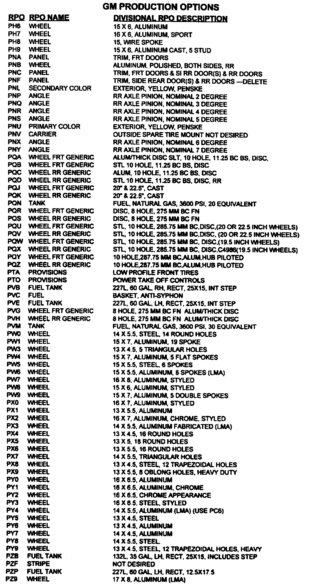 List of Regular Production Option (RPO) Codes