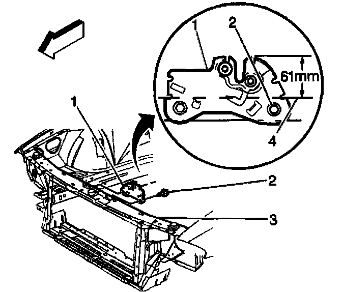 2. Ensure that the top edge of the hood primary latch (1) is 61 mm (2.4 in) from the top of the radiator support (4). This is the starting point for the up/down latch adjustment.