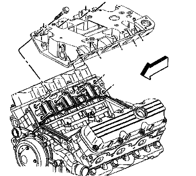 NOTICE: The two bolts which fasten the lower intake manifold to the cylinder head are accessible only after the upper intake is removed. The bolts are located in the right front and left rear corners of the lower intake manifold. Remove the upper intake manifold to service the lower intake.1. Remove the EGR outlet pipe from the intake manifold.