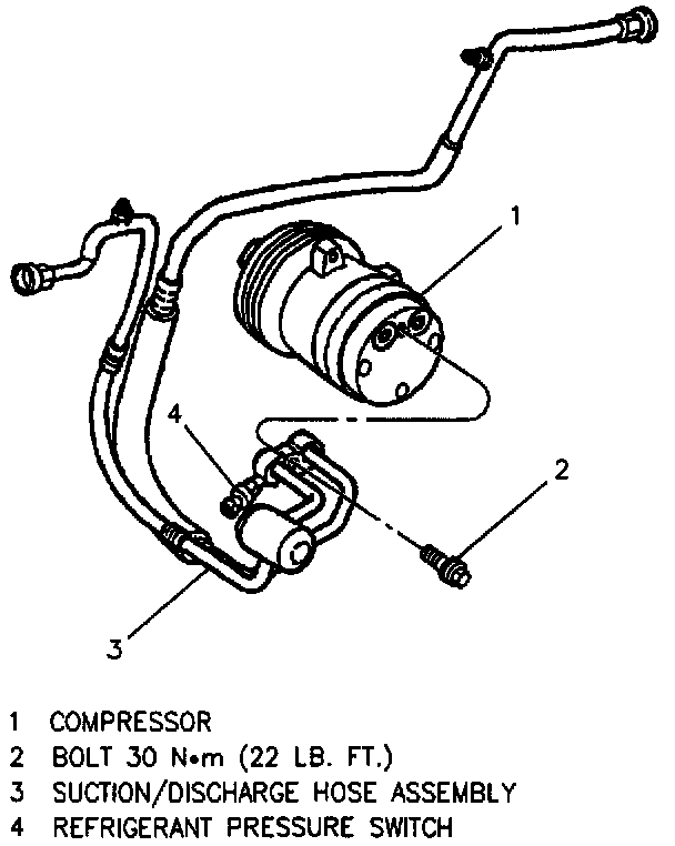 2. Bolt attaching A/C compressor hose assembly to rear of A/C compressor.