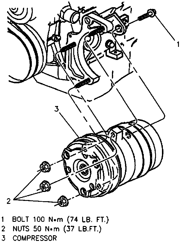 2. A/C compressor mounting bracket retaining bolts.