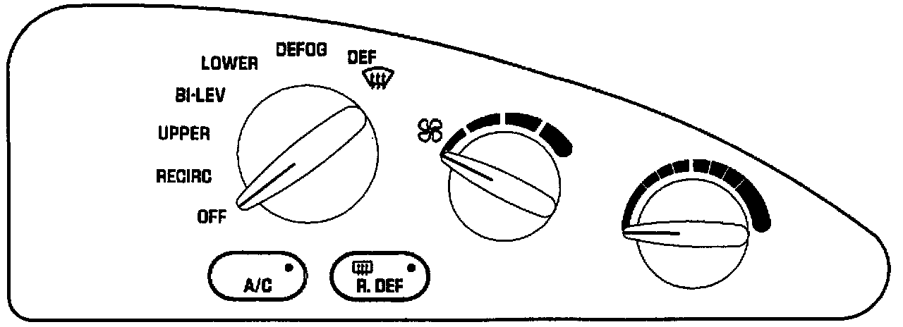 The heater and A/C control is the vehicle operator's control point for the manual air conditioning system. The heater and A/C control includes a rotary knob to select the system operating modes (OFF, MAX A/C, NORM A/C, BI-LEVEL, VENT, HEATER, DEFOG, DEFROST), a temperature control and fan speed rotary knob and a rear defogger switch.
