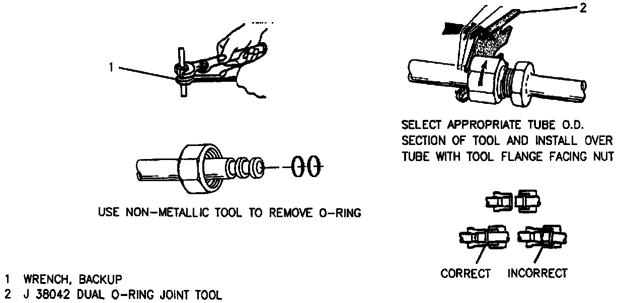 2. Place tool J 38042 on the refrigerant line directly behind dual O-ring joint female nut and hold pressure against nut.