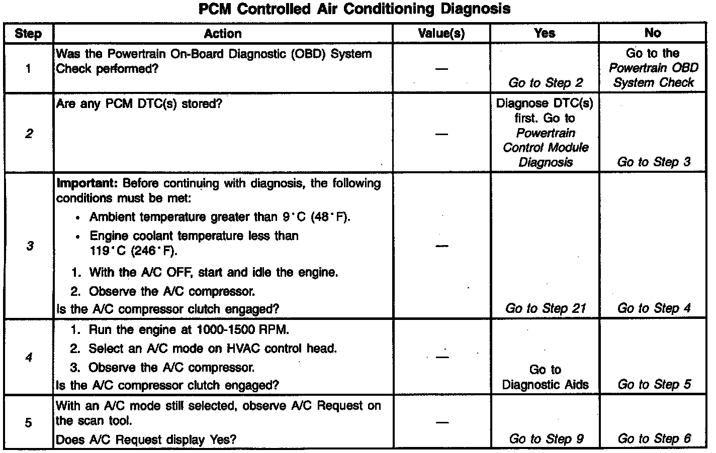 2. Stored diagnostic trouble codes may disable the A/C compressor. This diagnostic table may lead to improper diagnosis and replacement of good parts if diagnostic trouble codes are present.