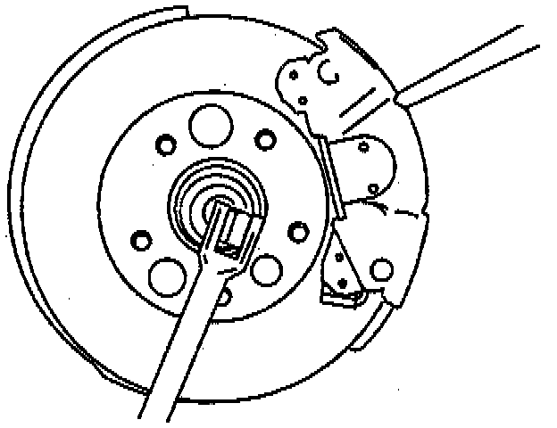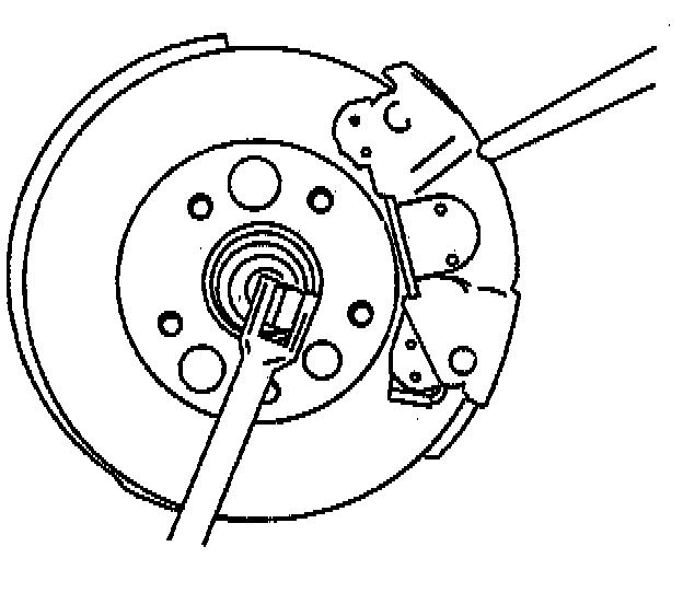 8. Insert drift punch or screwdriver into the caliper and rotor to prevent the rotor from turning.