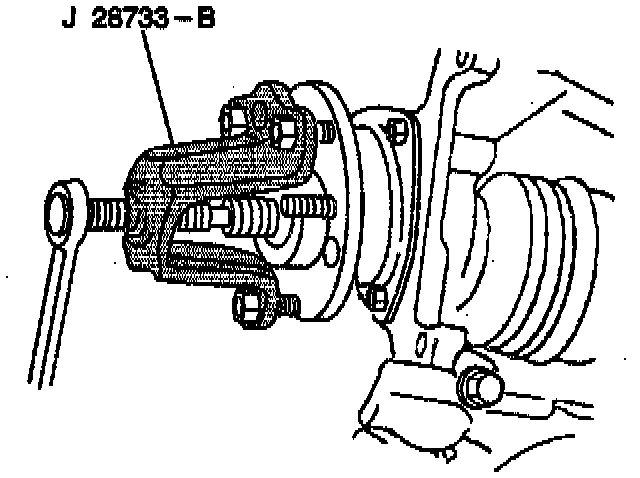 10. Using the J 28733-B, separate the hub and bearing from the drive axle. Clean rust and foreign material from the knuckle mounting face, bore and chamfer to allow proper seating of the bearing into the knuckle.