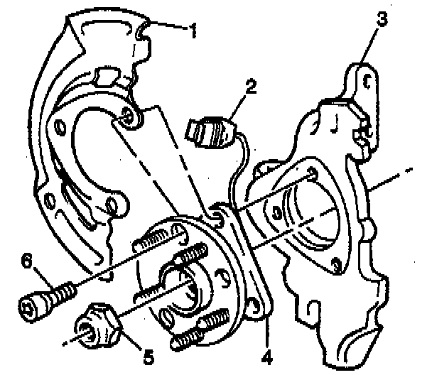 4. Install the dust shield (1), bearing bolts (6) and hub. Take care not to damage the bearing outboard lip seal.