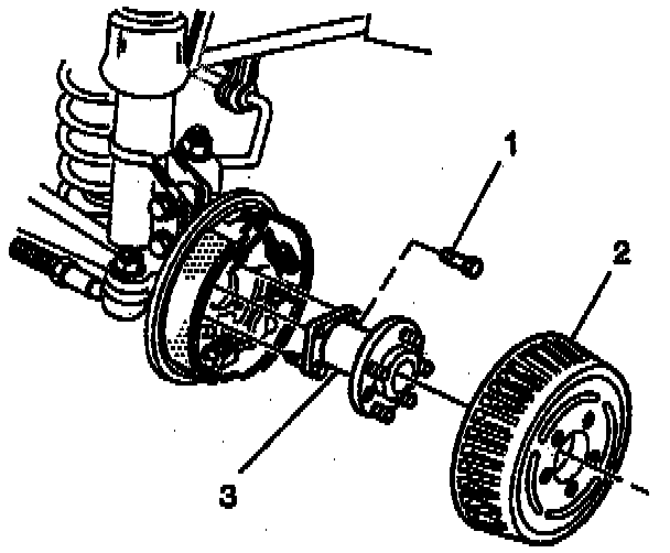 Important: The bolts which attach the hub and the bearing also support the brake assembly. When removing these bolts, support the brake assembly with a wire or by other means. Do not let the brake line or the ABS electrical wire support the brake assembly.