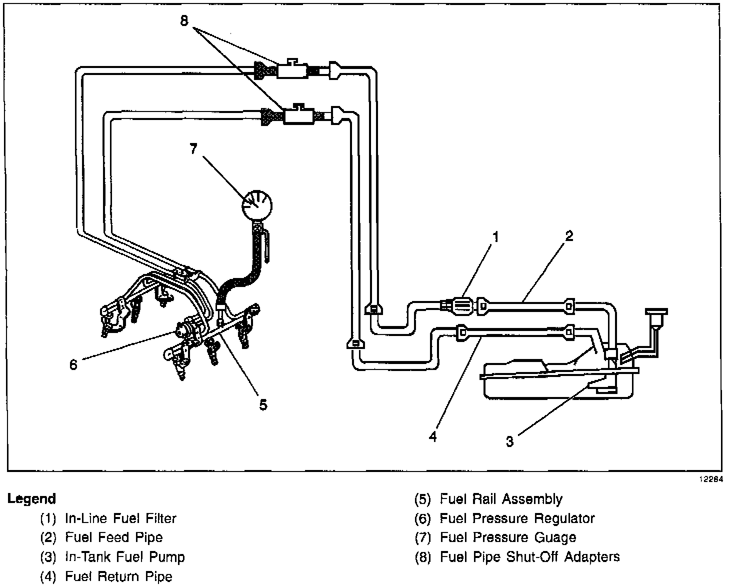 When the ignition switch is turned ON, the Powertrain Control Module (PCM) will turn ON the in-tank fuel pump. The in-tank fuel pump will remain ON as long as the engine is cranking or running and the PCM is receiving reference pulses. If there are no reference pulses, the PCM will turn the in-tank fuel pump OFF 2 seconds after the ignition switch is turned ON or 2 seconds after the engine stops running. The in-tank fuel pump is an electric pump, attached to the Fuel Sender Assembly. The in-tank fuel pump supplies fuel through the fuel feed pipe, and in-line fuel filter to the Fuel Rail Assembly. The fuel pump is designed to provide fuel at a pressure above the pressure needed by the fuel injectors. A fuel pressure regulator, attached to the Fuel Rail, keeps the fuel available to the fuel injectors at a regulated pressure. Unused fuel is returned to the fuel tank by a separate fuel return pipe. The fuel pressure gauge and fuel pipe shut-off adapters are used for fuel system diagnosis.