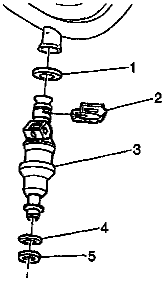 The fuel injector lower O-ring (5) uses a nylon collar, called the O-ring backup (4), to properly position the O-ring on the fuel injector. Be sure to reinstall the O-ring backup, or the sealing O-ring may move on the fuel injector when installing the fuel rail. If the sealing O-ring is not seated properly, a vacuum leak is possible and driveability complaints may occur.