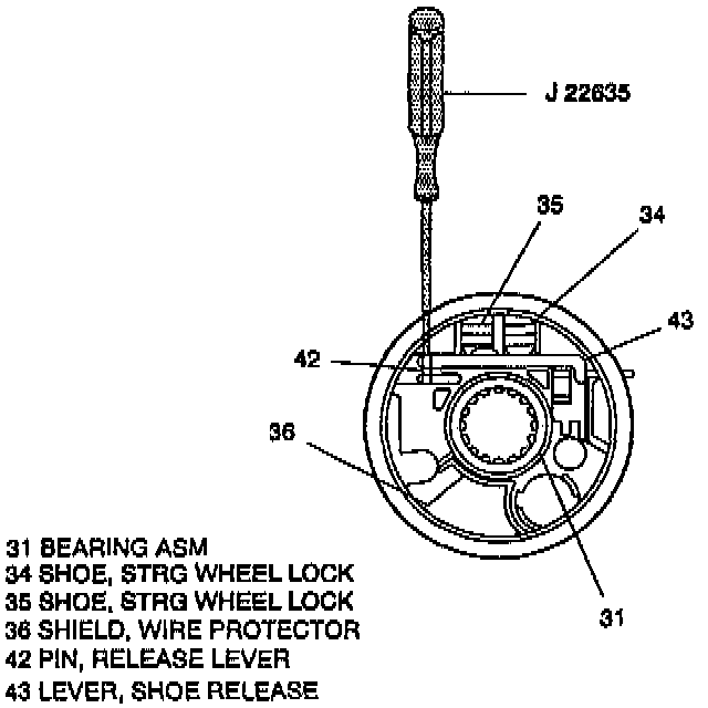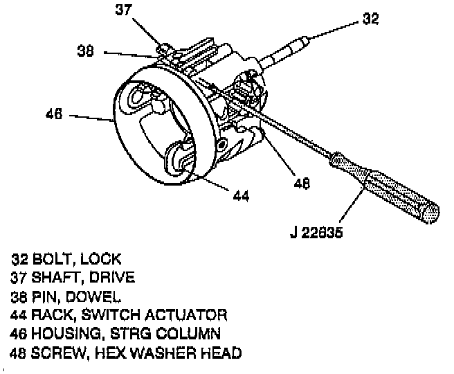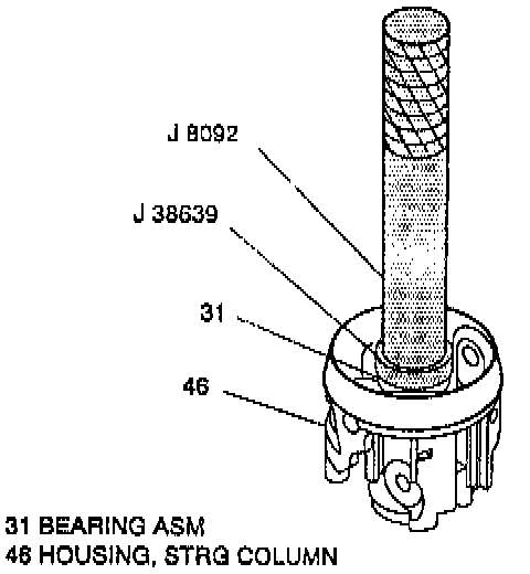 k. Bearing assembly (31) lubricated with lithium grease to column housing (46) using J 38639 and J 8092.