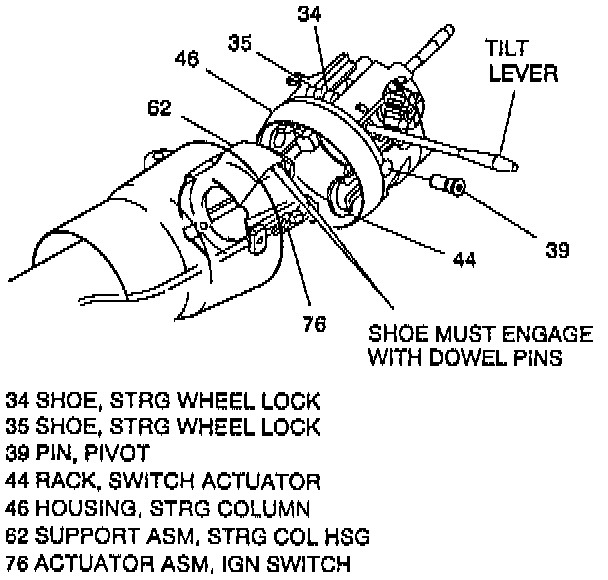 CAUTION: Install ignition switch (80) to jacket (72) with switch in "OFF-LOCK" position. New ignition switch will be pinned in "OFF-LOCK" position. Remove plastic pin after switch is assembled to column. Failure to do so may cause switch damage.