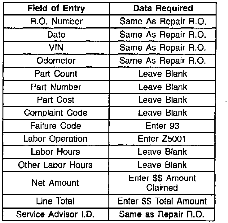 Refer to the table (Claim Type Compatibility) which details the type of claims (including special claims) when parts expediting is applicable for the covered vehicle (or part) failure. Please refer to your WINS Claim Processing Manual, Section VII for special claim type details. The Z5OOO and Z5OO1 operations DO NOT require a special claim type.